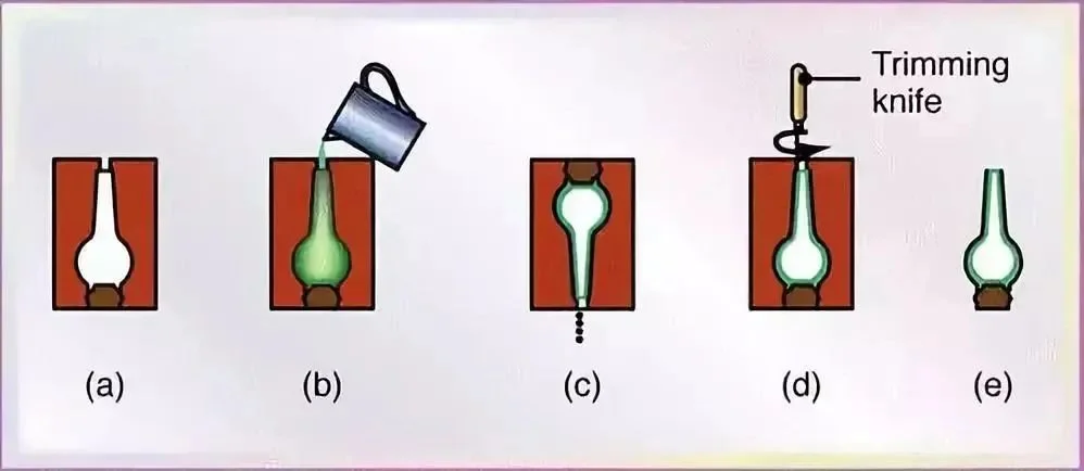 The grouting molding method is to inject the prepared mud into the gypsum model, because the gypsum model has air permeability and water absorption performance, after the mud contacts the model, the water in the mud will gradually be sucked into the model wall, and the fine particles in the mud will be evenly arranged into a thick mud layer with the shape of the model, and when the thick mud layer reaches the expected thickness, the excess mud in the model can be poured out. After the water in the thick mud layer is absorbed by the model to achieve independent molding, the green body can be taken out and dried for repair.